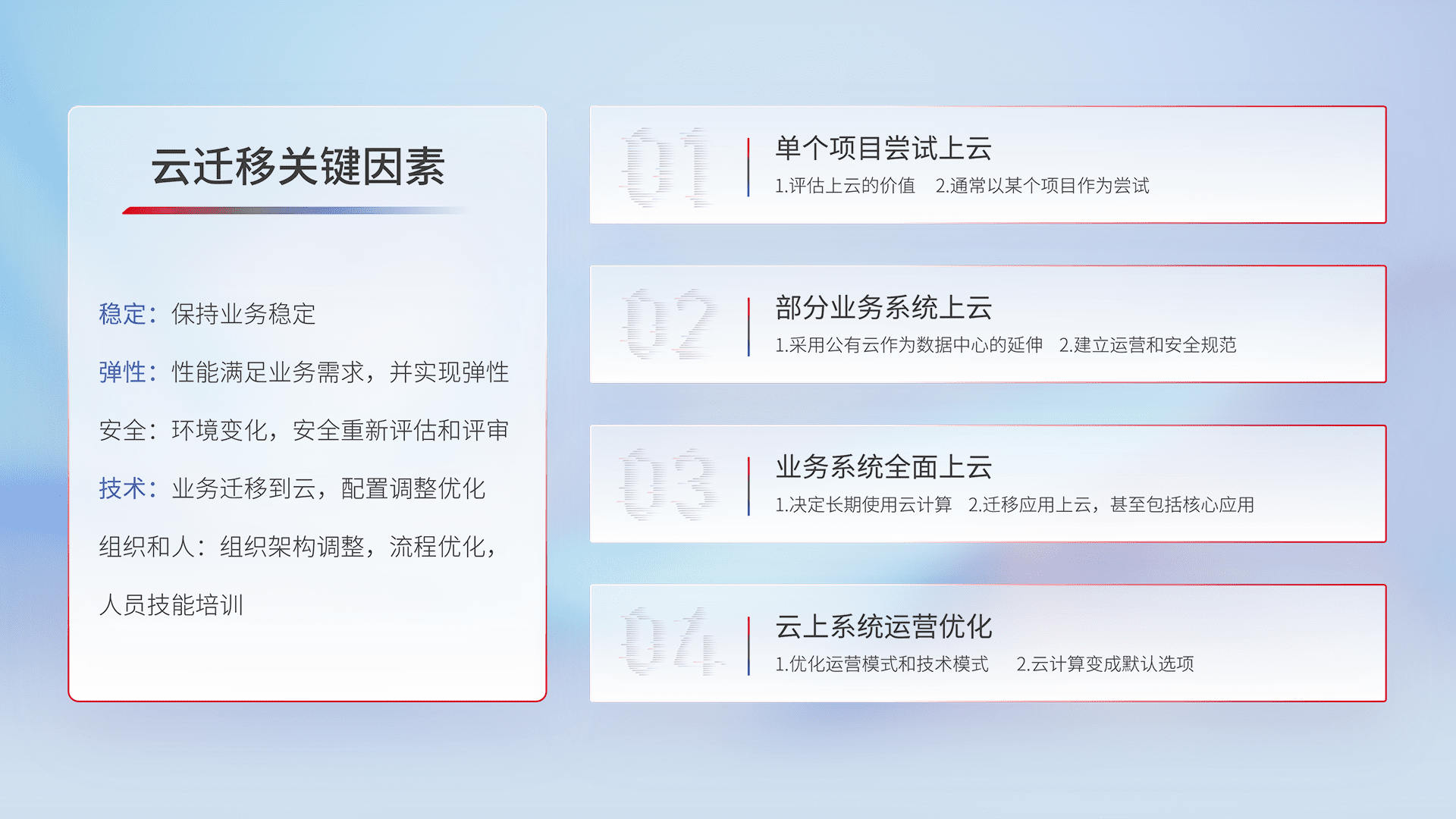 结合实际业务,,,,从规划设计、、、云平台选型、、、云原生改造、、、、数据迁移、、集成交付,,迁移全过程为客户识别最佳上云路径,,,,做好风险识别管理,,,设计网络架构、、、、身份权限、、、、安全审计合规、、、、操作审计、、、日志审计、、、、监控告警策略、、、、多站点容灾设计等,,,对云上基础设施进行整体规划,,,提升IT治理水平,,,,以满足弹性、、高可用、、高性能的需求。。。
