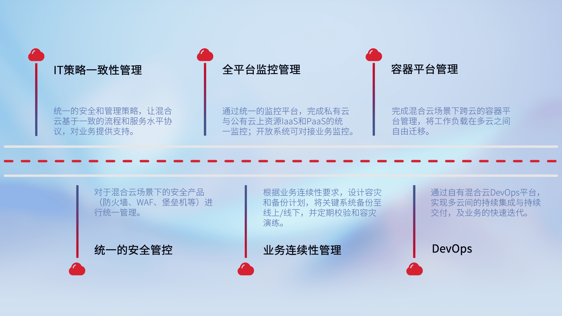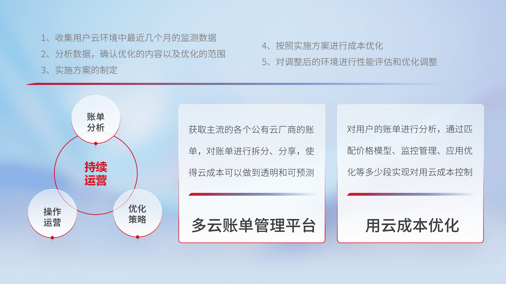 通过多云纳管,,以统一的资源数据模型把客户的云资源进行抽象和封装,,进而实现对多云资源的统一操作,,保障云资源管理的可靠性、、稳定性与可用性。。。量身定制化运维内容,,配置、、开发运维、、、、补丁管理、、备份、、、、监控、、、认证和访问管理、、、、审计和日常巡检等,,保障在用云过程中的可靠度,,,,稳定度以及高可用率。。